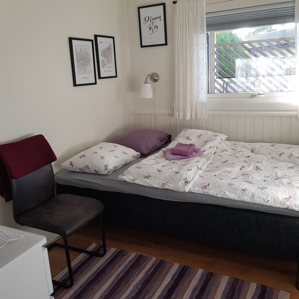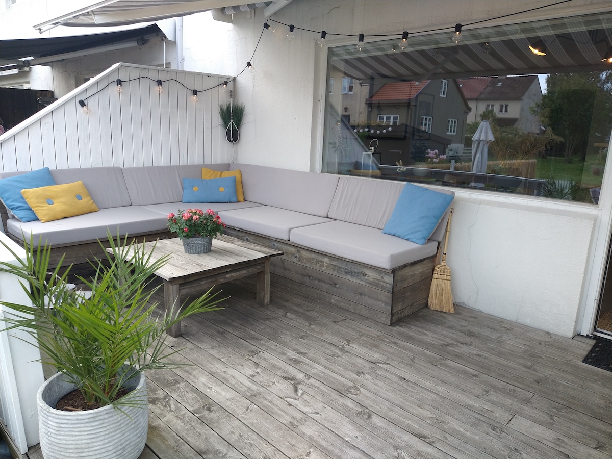 Lyst rekkehus med solrik, lun uteplass med hyggelige utemøbler og grill. Lekker stue med generøs sofaplass og fin spiseplass, stor flatskjerm, kabel-tv og bluray-spiller. Også smart-TV i to av soverommene. Tre soverom, alle med dobbelseng, ett bad og sengeplass til seks personer. Her får du alt dere trenger for en fin og komfortabel ferie, med et fullt utrustet og koselig hjem, som et alternativ til dyr og trang hotellovernatting. Nært til hav og 6 min til sentrum. Leies også ut til Palmesus.