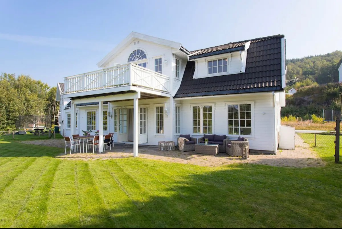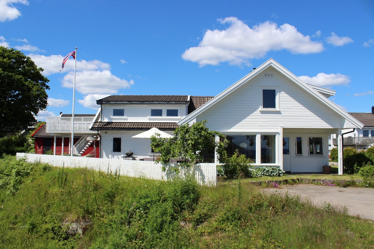 Enebolig i enden av blindvei, utsikt over byfjorden. Uteområde: Svært innbydende, barnevennlig innelukket uteområde uten innsyn fra naboer, med sjøutsikt. Utestue m/peis, 8 seters jacuzzi, stort spisebord til 12 personer. Flere sittegrupper rundt på eiendommen. Huset: 4 soverom; 3 rom med dobbeltseng, 1 rom dobbelt + enkeltseng. Ca 6 min gange til badevann med sandstrand for de minste, svaberg, stupefjell og badeflåte. Lekeplass, ballbinge og fotballbane. Flott turterreng med mange vann