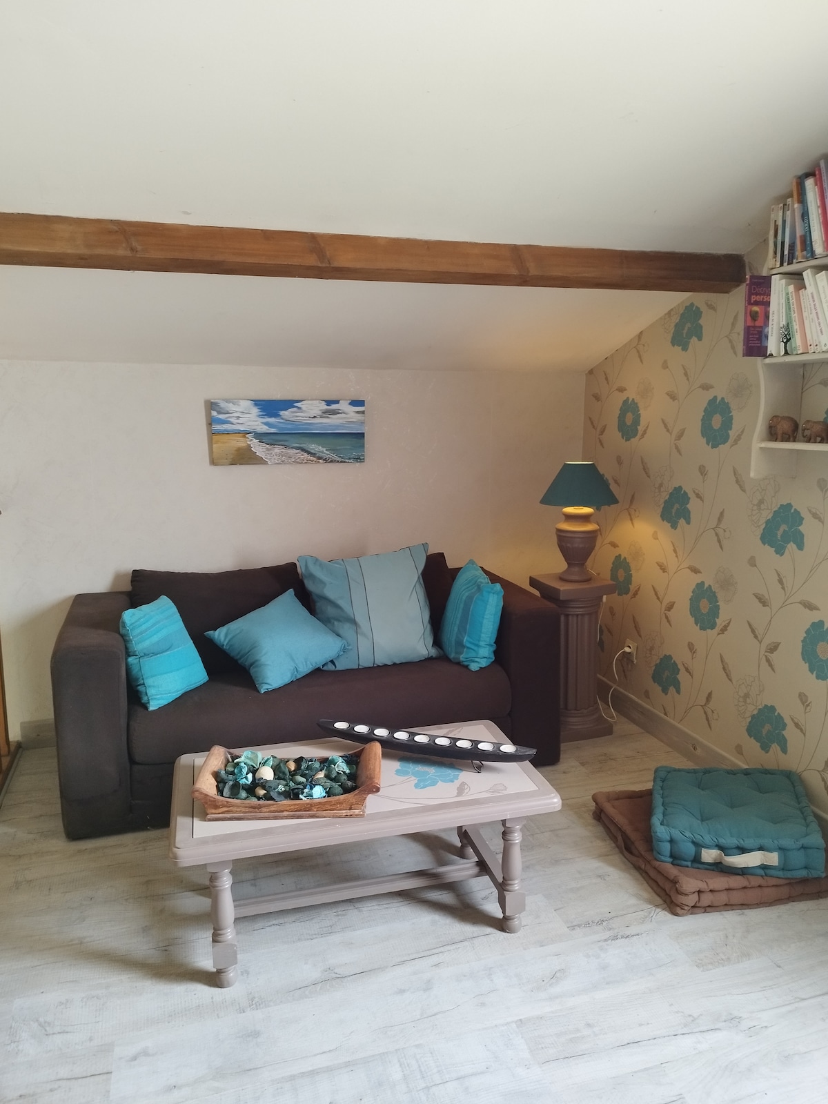 Chambre privée spacieuse et lumineuse pour une ou deux personnes avec vue sur le jardin. La maison se situe dans le village et propose une location pouvant accueillir jusqu'à cinq personnes. Cette chambre est équipée d'un lit en 140 cm X 190 cm avec draps, coussins et couettes, d'un grand placard comportant une penderie et étagères. La salle de bains mansardée est commune aux voyageurs et se situe au même étage. Elle comprend deux vasques, douche, baignoire, placard avec les serviettes de bain.