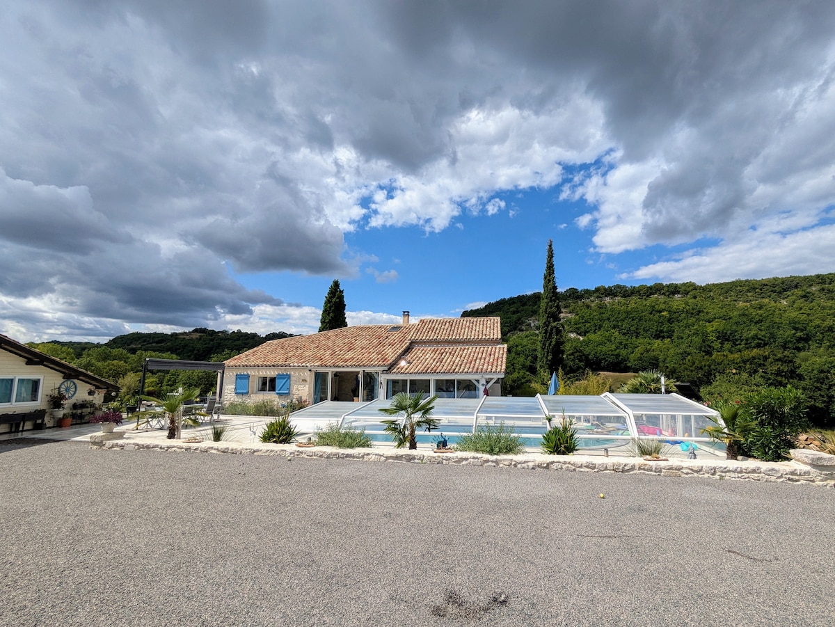 Gîte aménagé dans une grange avec vue dominante sur deux vallées à la campagne. Situé aux confins du Lot-et-Garonne, du Lot et du Tarn-et-Garonne et à proximité de la Dordogne. Grande piscine 10mx5m Grande pièce de vie avec cuisine équipée (plaque induction, four pyrolyse, lave-vaisselle, micro-ondes, cafetière, frigo +congélateur) Partie salon avec canapé d'angle 3 chambres, 2 salles de bain et 2 wc Salle de sport TV wifi Lave-linge Terrasse avec beau point de vue sur vallées