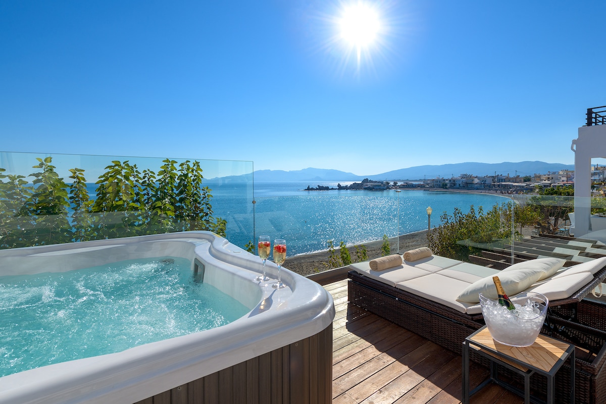 Villa Paradise Haraki is a 4-story seafront luxury villa with an amazing sea view. Located right next to the sea, at the bay of Haraki beach Rhodes-Greece. It is possible to accommodate up to 10 persons. Big outdoor jacuzzi with sea view and spacious indoor hammam. It has 5 bedrooms(4 double beds and one open traditional bed), 3 modern bathrooms, fully equipped kitchen, a comfortable living room with corner fireplace and a new space with Spa Jacuzzi with a wonderful sea view.