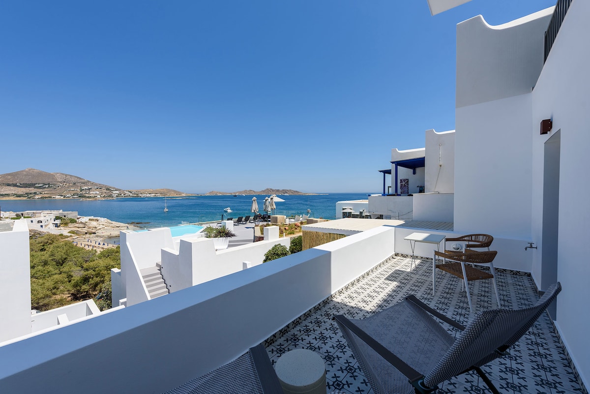 A spacious studio with sea views and a private hot tub, just steps from the beach. Flat Poseidon, part of Enosis Apartments, is located at Agia Anna of Naxos, steps from the long sandy beach and the crystal clear blue waters. The studio offers a generous interior layout and a private balcony with a sea view and a private hot tub, combining comfort and outdoor living. Designed in traditional Cycladic style, it is an ideal choice for guests who value space, privacy, and easy access to the beach.