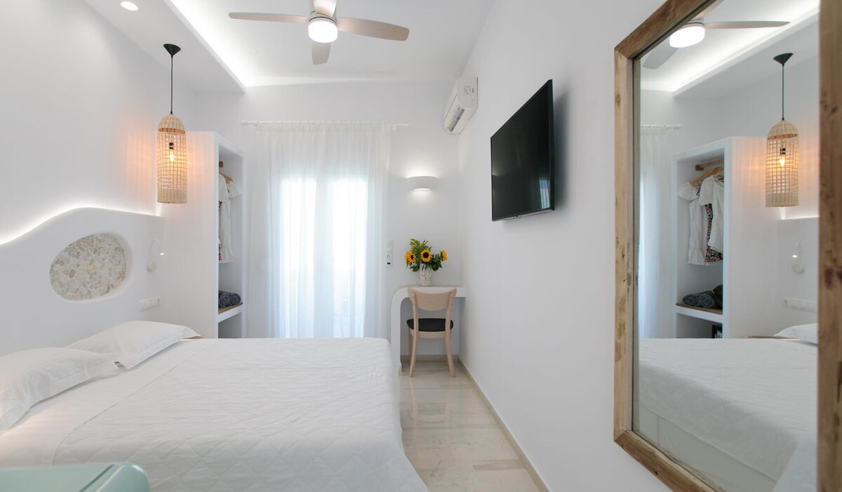 Relax at your balcony and enjoy the stunning sea and pool views. Naxos Contelibro upper floor superior room has a double bed, private bathroom and private balcony. Free Wi-Fi, daily cleaning service, and shared swimming pool. No detail is overlooked at this charming and upscale place to stay.