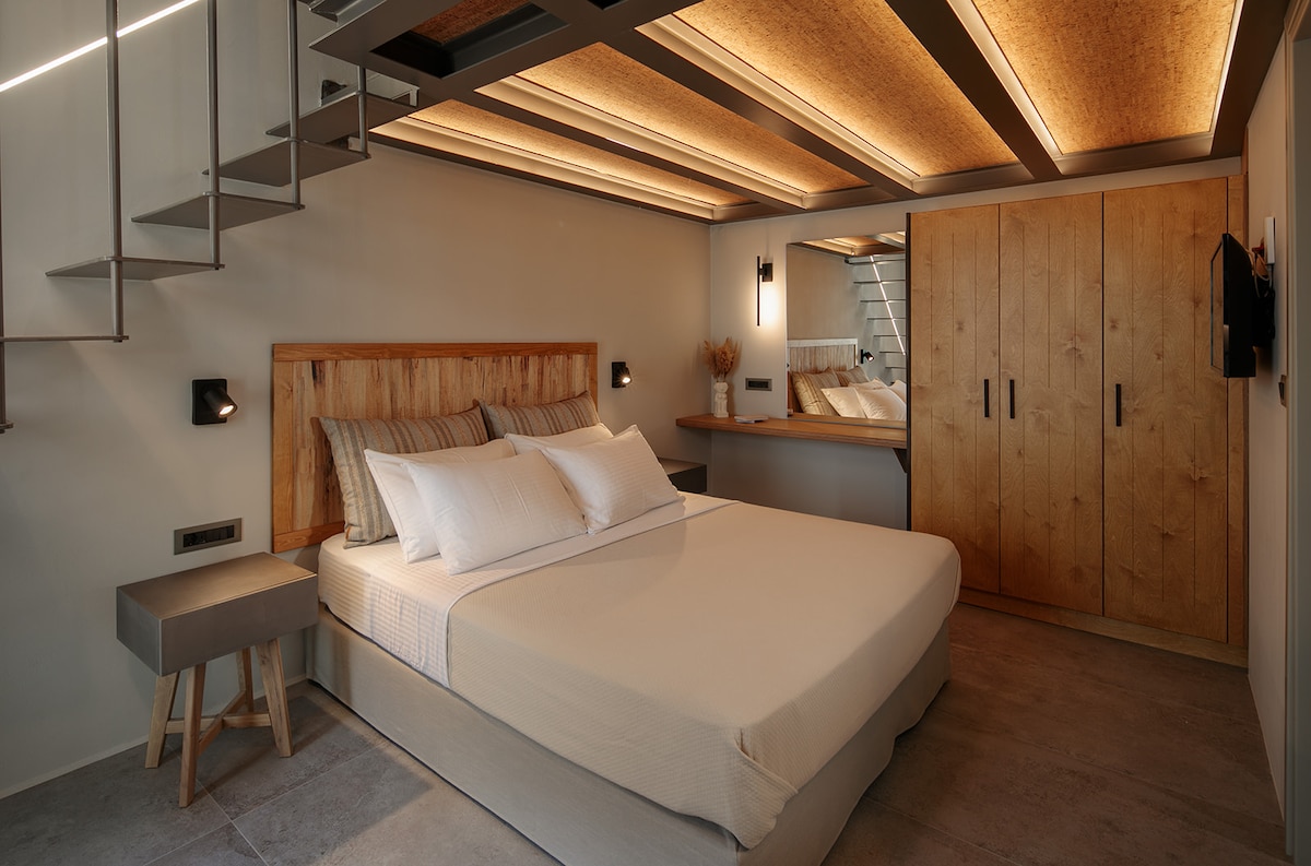 This suite is located on the second floor and provides a private balcony with a city view. Thoughtfully designed with tasteful decor and plenty of space, it offers comfortable beds, one double and one single bed, for a rejuvenating experience. The bathroom is elegantly modern, equipped with both a rainfall and a hand-held shower. The balcony is ideal for your relaxing moments. Feature of this type of suite is the outdoor hot tub on the terrace with panoramic view of Naxos Town.