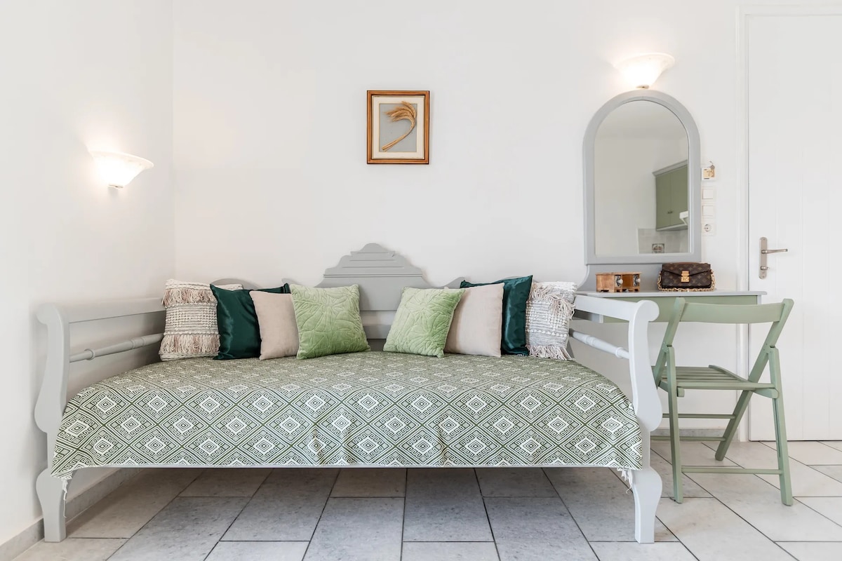 This Semi-basement suite is perfect for those who want a calm downtown place to feel their own. With a calm inner balcony looking to a quiet town street, this unit is perfect for simply relaxing, just a five-minute walk from the Naxos Castle. This suite, features a double bed and a single bed, a kitchen with cooking rings & refrigerator, air-conditioning, satellite TV and a spacious bathroom with shower.