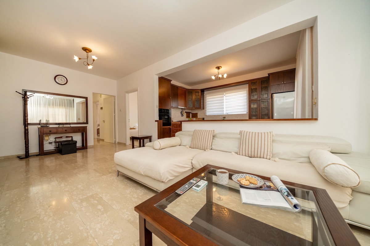A clean and newly renovated apartment in a recently renovated building ,located in a safe area, 7 minute walk from the beach and 5 minute walk from the main avenue. You can find anything you need with just a few minutes walk including cafeterias, restaurants, supermarkets, shops and night clubs. Consists of three bedrooms, living room, dining table for six, a fully equipped kitchen, 2 toilets, two showers and a veranda outside. Suitable for couples and families. PARTIES ARE NOT ALLOWED 🚫,