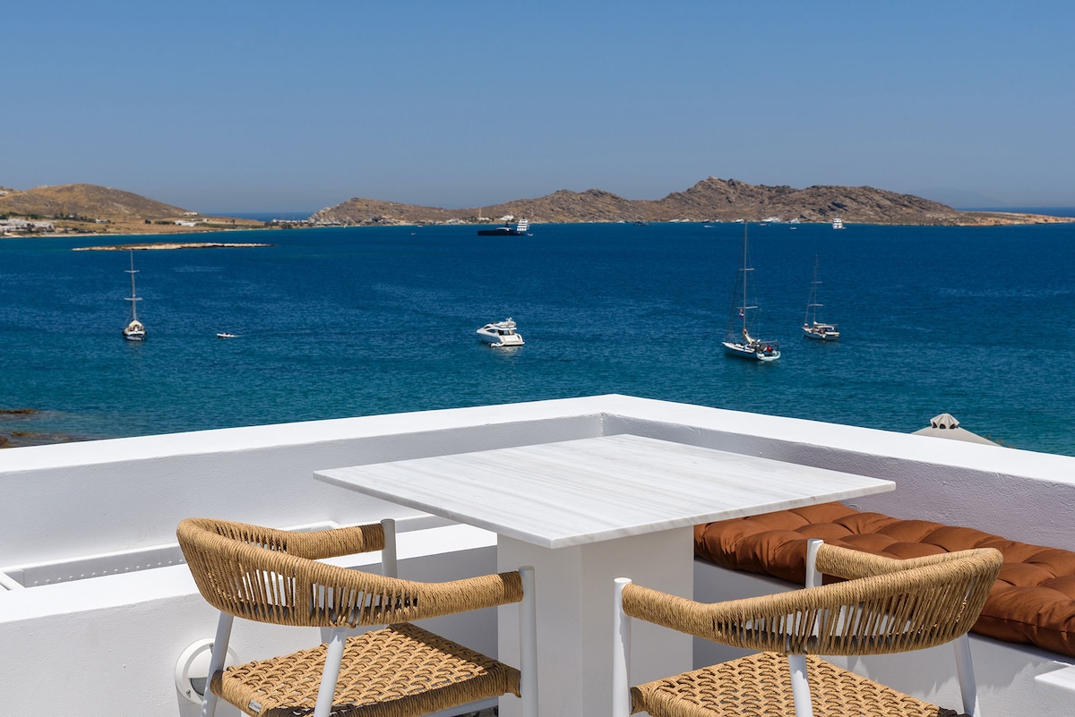 Open the sea-blue shutters and let in the cooling breeze, then whip up a snack at the urban concrete kitchen countertop at a breezy waterfront retreat. Step onto the spacious, leafy veranda for leisurely sunset drinks with unobstructed ocean views! The apartment is situated next to a sandy beach for a morning swim and a 2-minute walk from the center of Naousa and its main square. Shops, restaurants, bars, and clubs are within walking distance, yet the area is very quiet and calm!