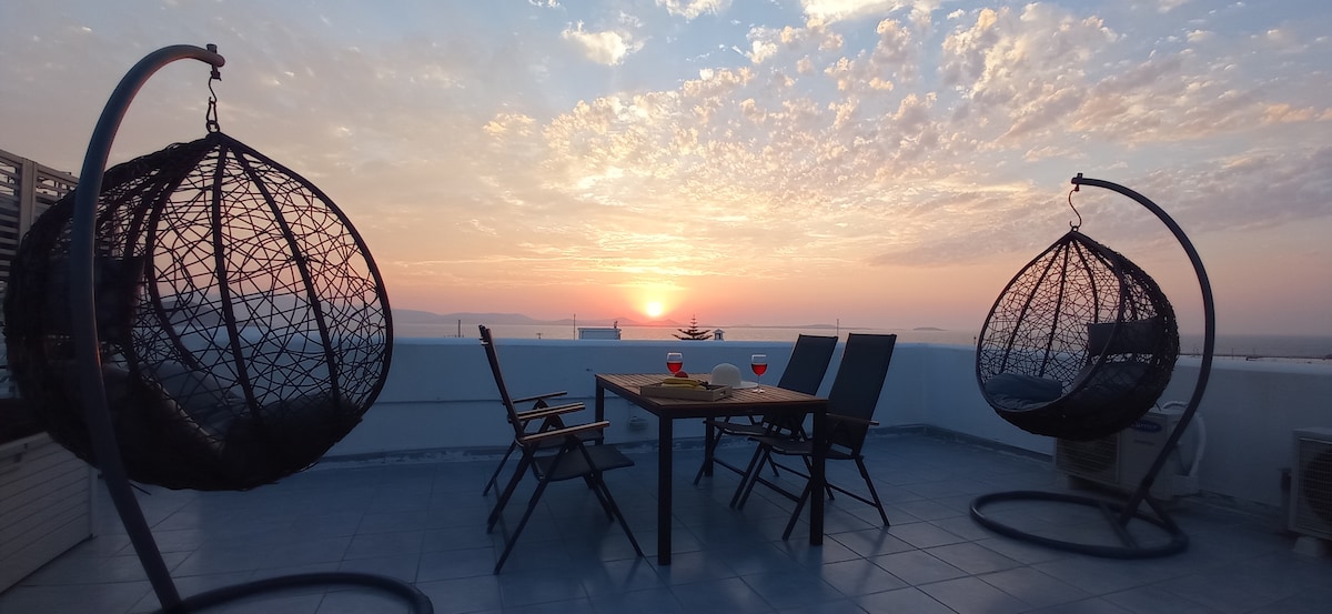 Διαμπερές και ευρύχωρο ρετιρέ - διαμέρισμα (38 τμ.) στο κέντρο της Νάξου, μόλις 200 μ. από την παραλία του Αγίου Γεωργίου και 500 μετρα απ το καστρο και το λιμανι οπου βρισκεται η πλειοψηφια των εστιατοριων και των μπαρ.Διαθέτει ταράτσα με θέα τη θάλασσα! Ηρεμία και χαλάρωση για τις καλοκαιρινές σας αποδράσεις, στο κέντρο του νησιού! Σας περιμένουμε!