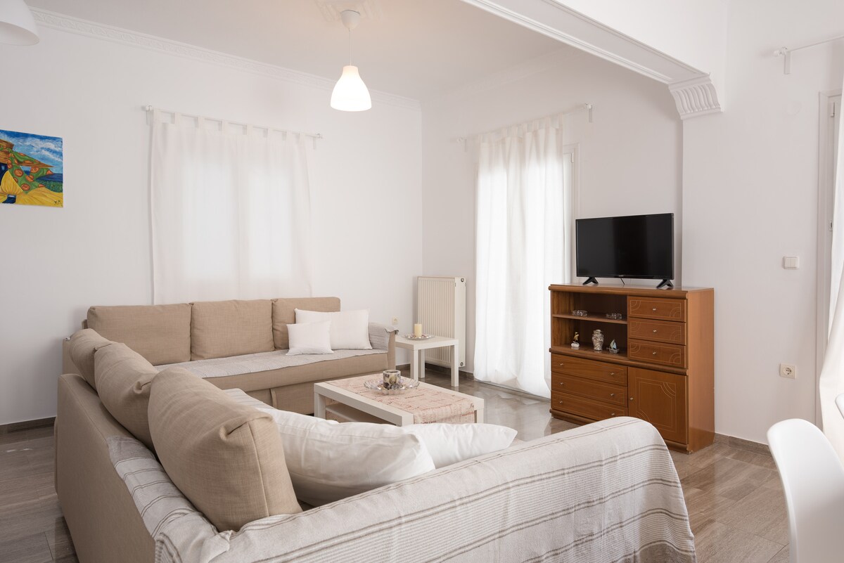A spacious 73 s q m apartment with two bedrooms, living room,a fully equipped kitchen and bathroom, decorated in light colors and open out to a balcony. It can accomodate up to 8 people and is suitable for group of friends or families that want to enjoy their stay in Naxos by combining a quite neighbourhood and activities.Facilities include: 3 air/ condition,3 flat screen TV, anatomic mattresses,fully equipped kitchen,laundry machine,bath amenities.