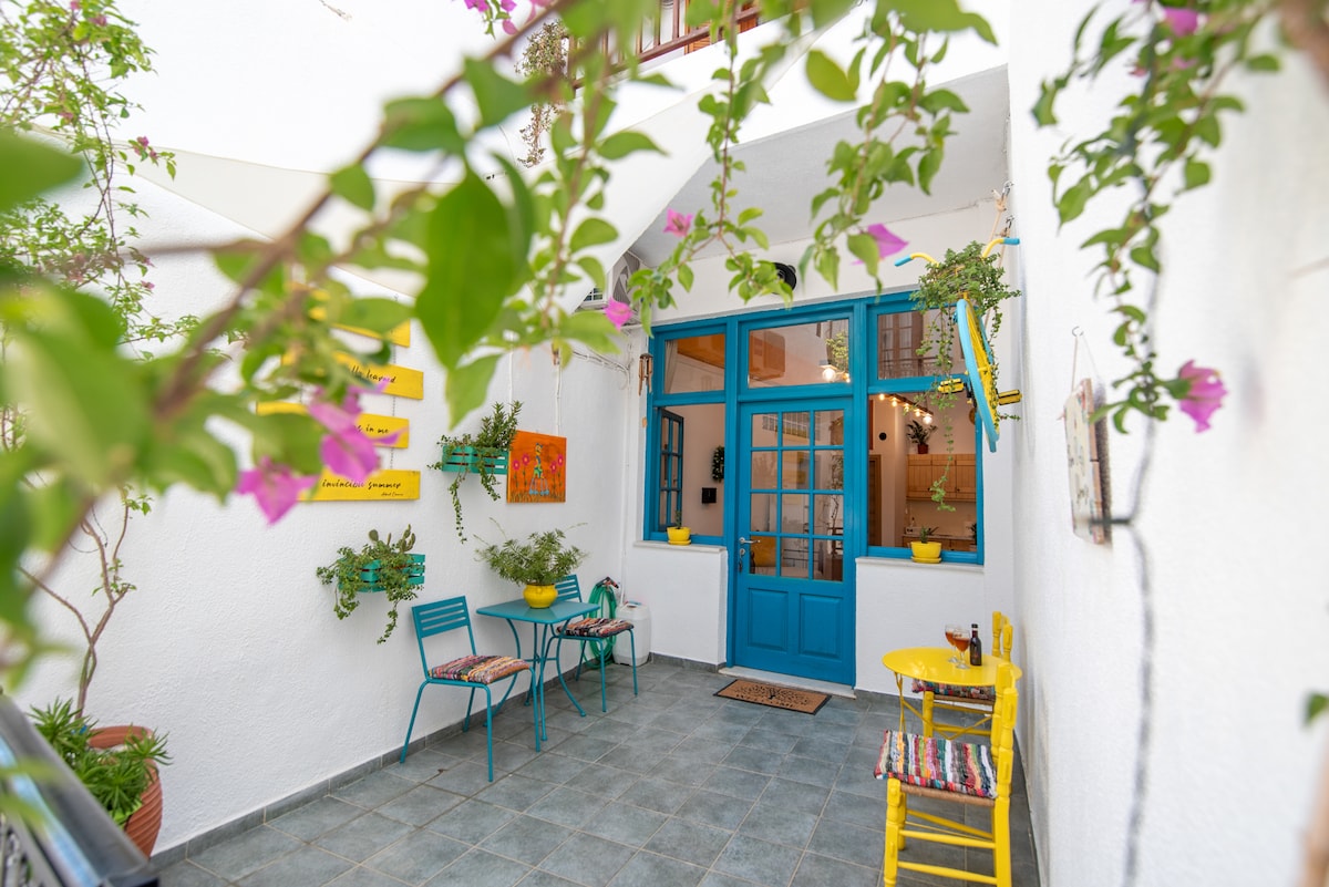 A unique aesthetic apartment with a beautiful private patio and lots of art touches, located in a picturesque neighbourhood in the heart of Naxos Town that can host up to 5 guests. Located 10' on foot from the Port, 1'-2' from the Market and other places of interest (castle, museums, etc) and entertainment (bars, restaurants, etc). If you travel without a car, no worries; the closest bus station to the most popular beaches and villages is at 3' on foot. Free parking space at 3' on foot!