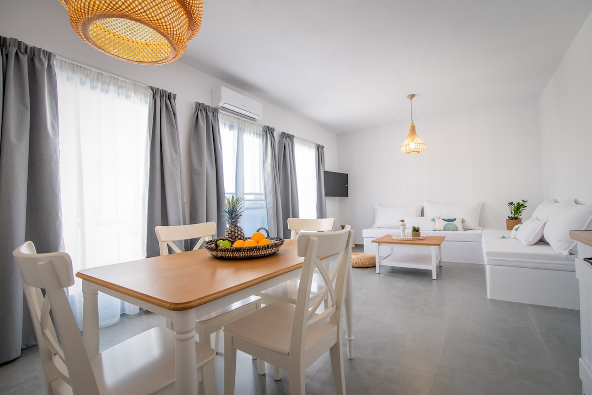 A spacious studio with sea views and a private hot tub, just steps from the beach. Flat Poseidon, part of Enosis Apartments, is located at Agia Anna of Naxos, steps from the long sandy beach and the crystal clear blue waters. The studio offers a generous interior layout and a private balcony with a sea view and a private hot tub, combining comfort and outdoor living. Designed in traditional Cycladic style, it is an ideal choice for guests who value space, privacy, and easy access to the beach.
