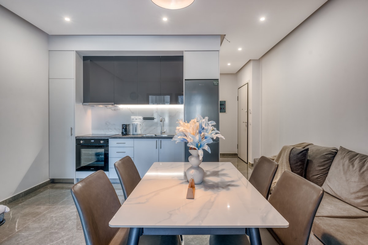 Φωτεινό και κομψό διαμέρισμα κοντά στο METRO🚇. Διαθέτει 1 υπνοδωμάτιο με άνετο διπλό κρεβάτι 🛌 και καθιστικό με καναπέ-κρεβάτι. Μοντέρνα κουζίνα με τραπεζαρία, φροντισμένο μπάνιο. Minimal διακόσμηση που προσφέρει ηρεμία 🧘. Ιδιωτική αυλή με τραπεζάκι για απολαυστικά πρωινά και χαλαρές βραδιές🌛. Βρίσκεται σε ήσυχη γειτονιά, κοντά σε καφέ, φούρνο 🥖👨🍳, σούπερ μάρκετ 🍉🥗🍖 και Μέσα Μαζικής Μεταφοράς 🚌🚊🚕. Κάντε κράτηση τώρα!