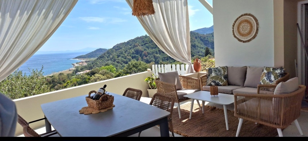 Τα γαλαζοπράσινα νερά της θάλασσας σε συνδυασμό με το πράσινο των ελαιόδεντρων και πεύκων δημιουργούν ένα ανεπανάληπτο σκηνικό για ξενοιασιά και ηρεμία. Η βεράντα με τα κυπαρίσσια είναι το σημείο αναφοράς του καταλύματος. Από αυτή τη βεράντα προσφέρεται απερίσπαστα η μοναδική θέα. Αλλά αυτό που σίγουρα θα σας μείνει αξέχαστο είναι η Ανατολή του ηλίου.Το κατάλυμα προσφέρει στον επισκέπτη την μοναδική εμπειρία να απολαύσει τις διακοπές του.