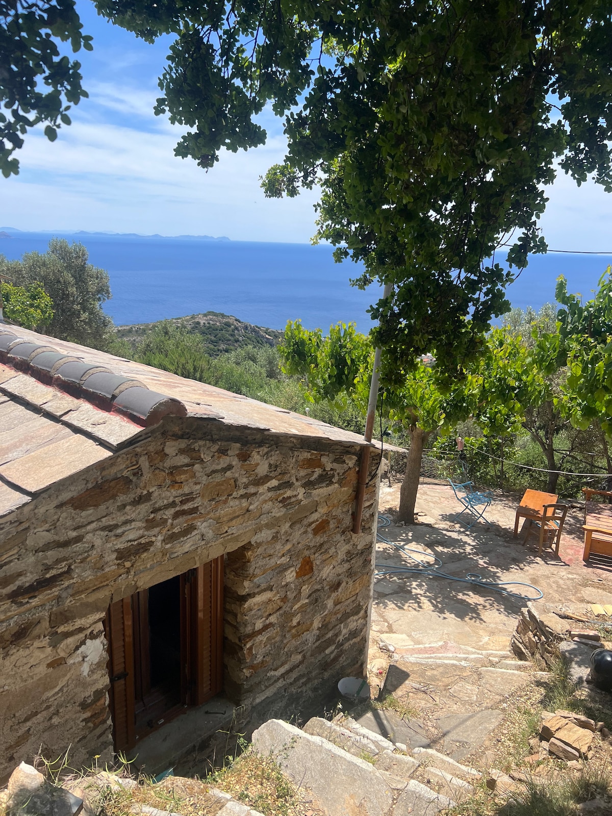 A beautifully renovated 100 year old stone house nestled amongst plane, eucalyptus and olive trees with a unique outdoor stone seating area surrounding an ancient olive press. Wake up to beautiful views of the sea and the mountains in this peaceful setting. An ideal place to decompress and get inspired by the sounds, scents and vibes of nature. Our 6000m2 property is full of olive and fruit trees, organic vegetable gardens, and authentic Ikarian herbs, all for your use.