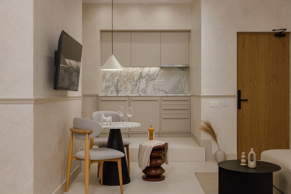Luxury Suites by Lato have just renovated in the winter of 2023 to keep up with the local architecture. The aesthetic that inspires luxury dominates the interior, while outside is a private balcony with a table enticing its sophisticated guests to enjoy the warm tranquility, the sunset, the sea view and the view of the lake of Agios Nikolaos. The Suites are located in one of the most central parts of the city, with the market, the coastal road and Lake Voulismene just a few meters away.