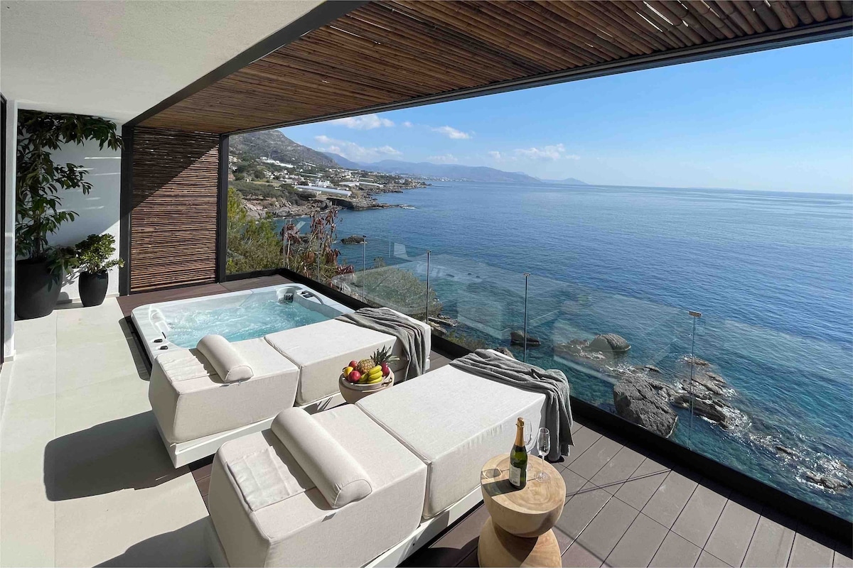 Απολαύστε γαλήνιες διακοπές στη θάλασσα! Ξυπνήστε το πρωί βλέποντας από το κρεβάτι σας μια μοναδική ανατολή ηλίου. Χαλαρώστε στο υπαίθριο τζακούζι, στην κοινόχρηστη πισίνα, τις βεράντες, ακούγοντας τον ήχο των κυμάτων και το κελάηδισμα των πουλιών. Η θέα παντού είναι εξαίσια. Μπροστά σας το απέραντο γαλάζιο του Κρητικού Πελάγους, γύρω σας η εντυπωσιακή κρητική φύση. Από τα δύο σαλόνια ως τις κρεβατοκάμαρες, την τραπεζαρία, την κουζίνα, τα μπάνια, το υπαίθριο ντους, η θέα είναι συναρπαστική.