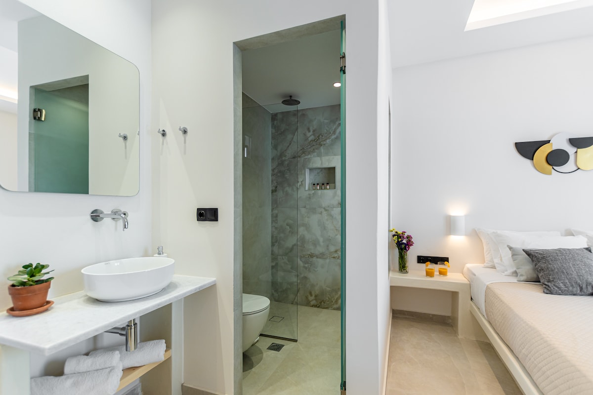 Our elegant double suites offer a serene and inviting escape. Each suite features a comfortable double bed, a modern bathroom with a refreshing shower, and a private balcony that opens to an unforgettable sea view. Breakfast of Olive Vista Suites is served at our family-owned Irida Vacation Suites, just 1.5 km away, where you can also enjoy the pool and all-day bar/restaurant, perfect for a relaxing swim or a sunny break.