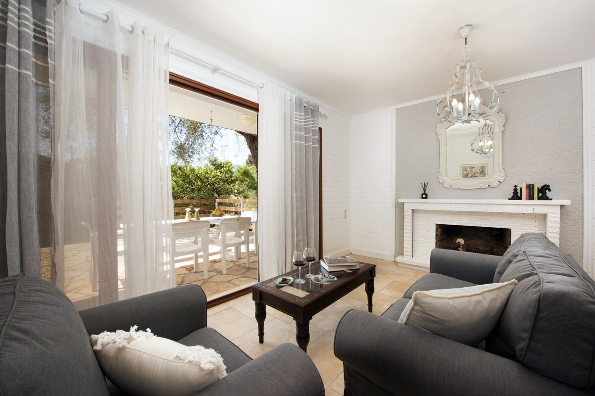 Our Villa Estia (92m2) is placed directly in wonderful Paleokastrista. The Sea view on Platakia bay and the port Alipa make this house a special place to be. Two bathroom, two bed room, a modern open fully equiped kitchen and a combined living and dining room with fireplace - all new made in 2018 - guarantee the best comfort for your stay. The house is for 4 - 6 persons, The sofa bed can be used for another 2 persons.