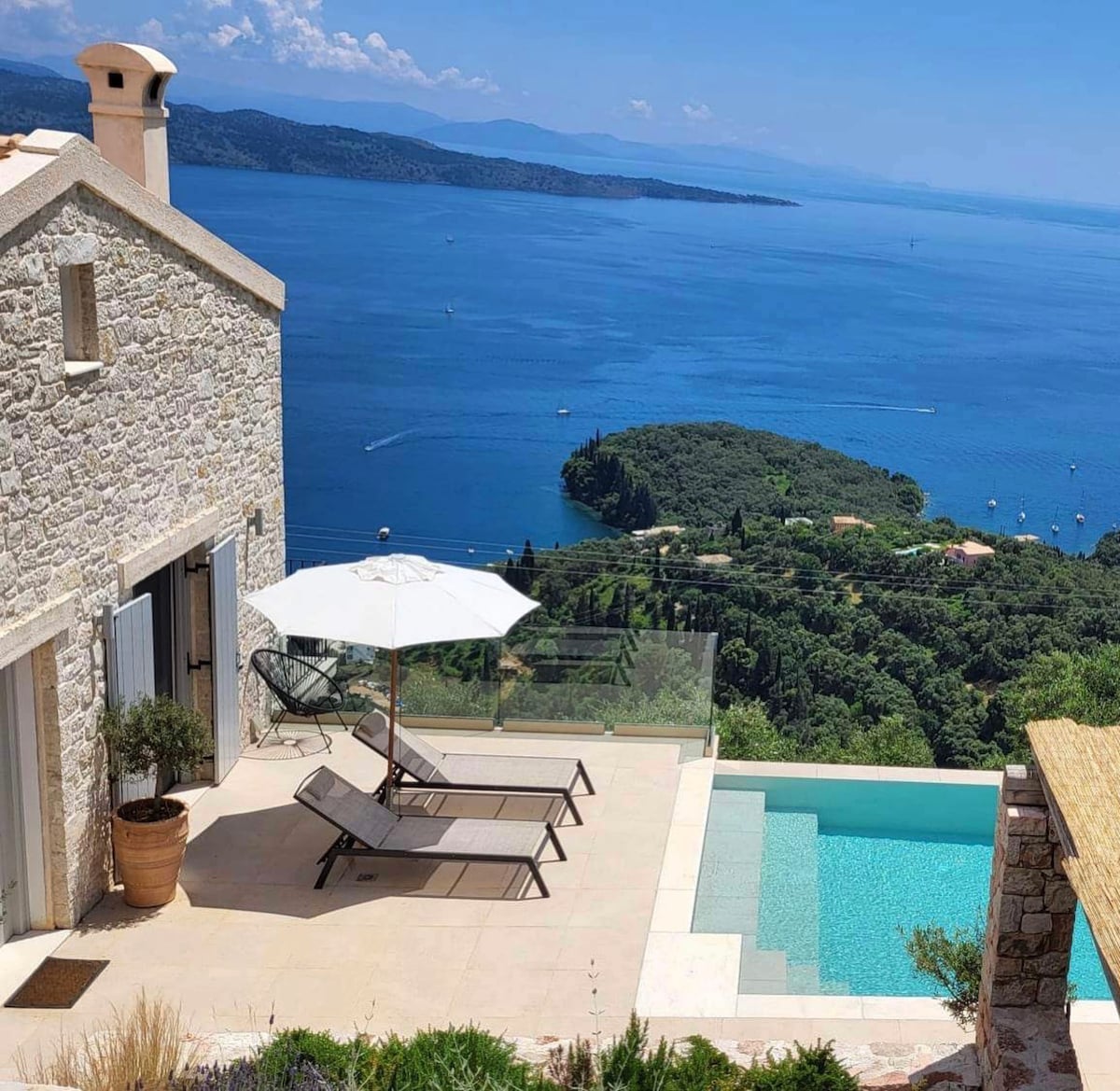 To elegancka, w prowansalskim stylu nowo wybudowana (2017), luksusowa willa oferuje fantastyczny widok na morze i jest idealnym miejscem na relaks z widokiem na zachód słońca. Jest bezprzewodowy Internet, kino domowe i telewizja satelitarna. Na zewnątrz znajdują się: basen kąpielowy , taras do z leżakami i kanapą , pergola, parking przed domem. Piaszczysta plaża Arillas, jedna z najpiękniejszych na Korfu, znajduje się zaledwie 10 minut spacerem od domu.