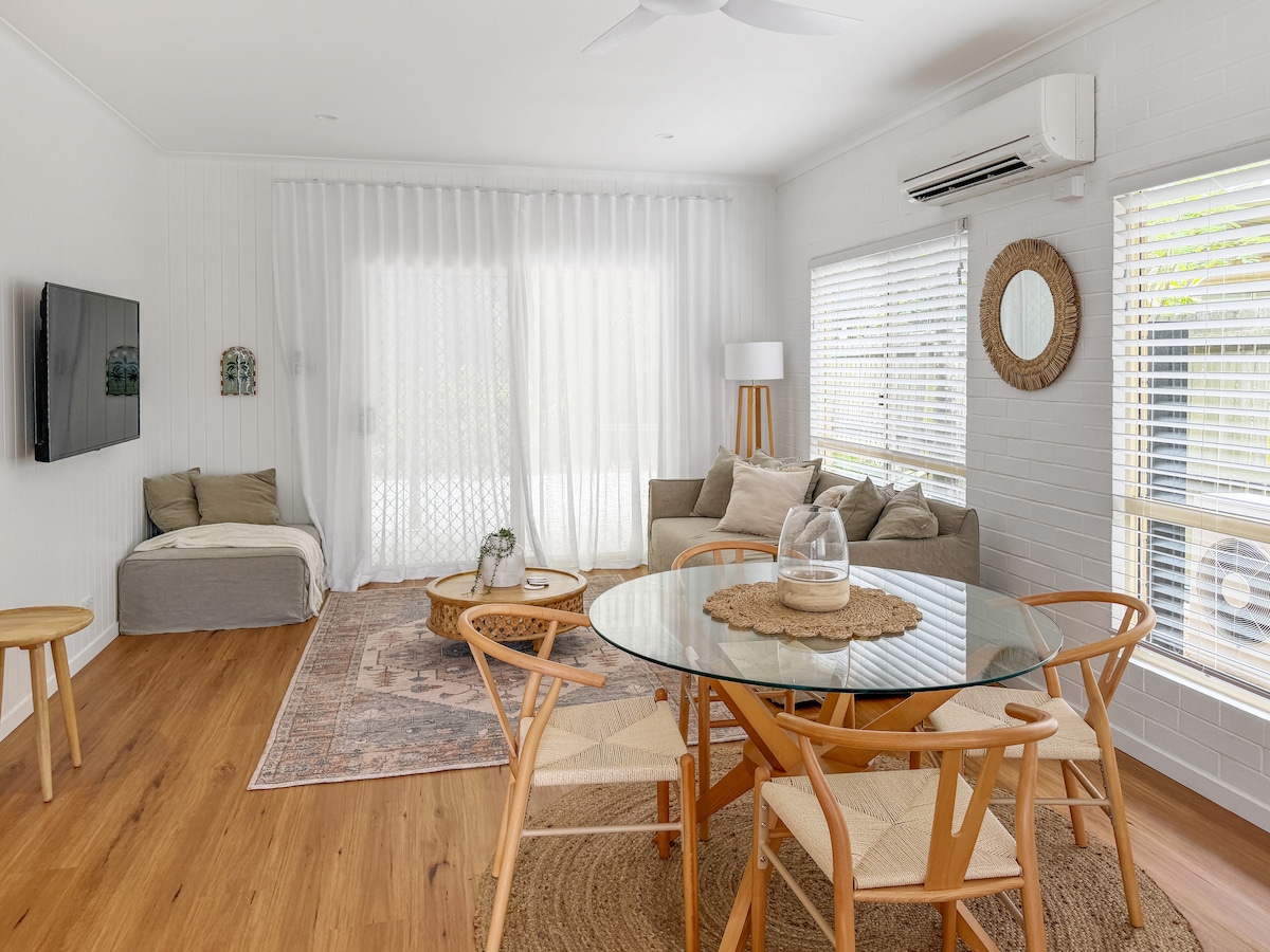 Agnes Break - Our 3-bedroom, 2-bath townhouse styled with a coastal modern touch. Located just 400m from Agnes Water surf beach, cafes, and the town centre. Ideal for families, it offers two separate living areas, giving kids and adults their own spaces to relax. The spacious deck is perfect for outdoor dining and enjoying the warm weather year-round. With all the comforts of home and complimentary surfboards for the beach, it’s a laid-back spot to enjoy the relaxed coastal lifestyle.