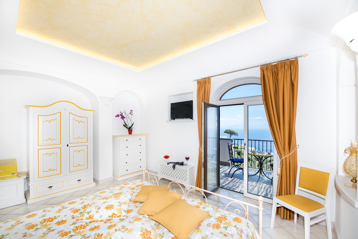 Amazing sunsets across the Gulf of Sorrento from the property's balcony overlooking the sea of historic Villa from '800. Charming, elegant and well-equipped holiday home in exclusive property. A double bedroom, a living room with a very comfortable double sofabed, two bathrooms, kitchenette. It features by stone walls, high ceilings, antique furniture, alongside contemporary features such as infrared sauna, chromotherapy shower, fast wifi. Private patio. Free car parking. CUSR 15063080EXT1055
