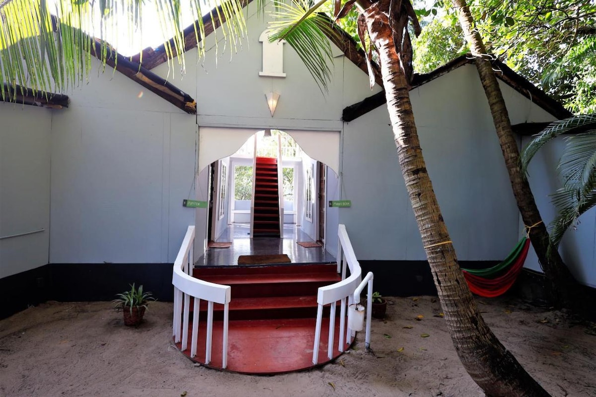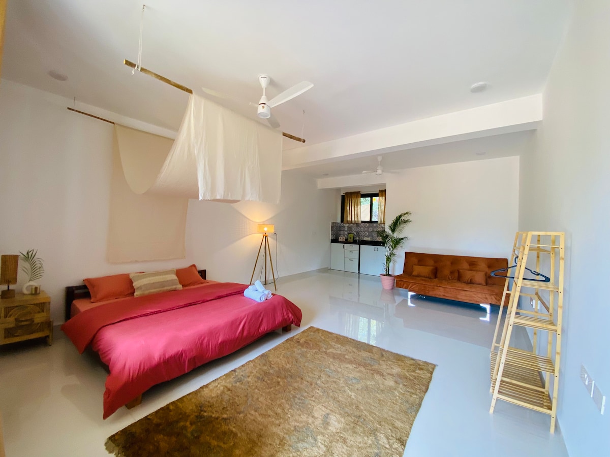 Cozy seaside cottage on the peaceful Northside of Patnem Beach, Colomb Bay—perfect for a relaxing escape. The air-conditioned room features a double bed, workspace, private washroom, and a small kitchen with essentials, kettle, and fridge. Enjoy sea views from the patio, high-speed Wi-Fi, and explore nearby spots with rental e-bikes. Wake up to waves and unwind in serene coastal comfort.