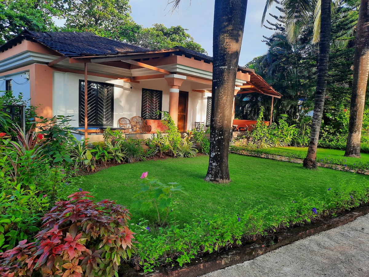 A 5 min walk to the beach, close to cafes and nightlife, our cottage is perfect for a cozy getaway. Tucked away in a secret garden, off the bustling Calangute street, you will be instantly transported to a beachy, calm oasis. The cottage is perfect for a romantic getaway, . solo adventure, or even a workation with Fast WIFI & a dedicated work desk. A little kitchenette means you can cookup some yummy meals We also help with scooter rentals on request, so you have a perfect holiday.