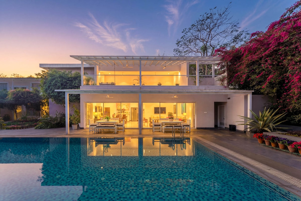 Escape to a private villa offering space, comfort, and tranquility in the city. Perfect for families. - Spacious Living: 3 bedrooms, 7 bathrooms, sleeps 10 - Entertainment: Private pool, gardens, and party space for 250 guests. - Convenience: Close to transport, supermarkets, with secure parking. - Relaxation: Greenery, rooftop, and private balconies. In a safe, accessible neighborhood, this villa is perfect for a peaceful getaway. Book now! Note: Pool is non-operational in winters (Nov-Feb)
