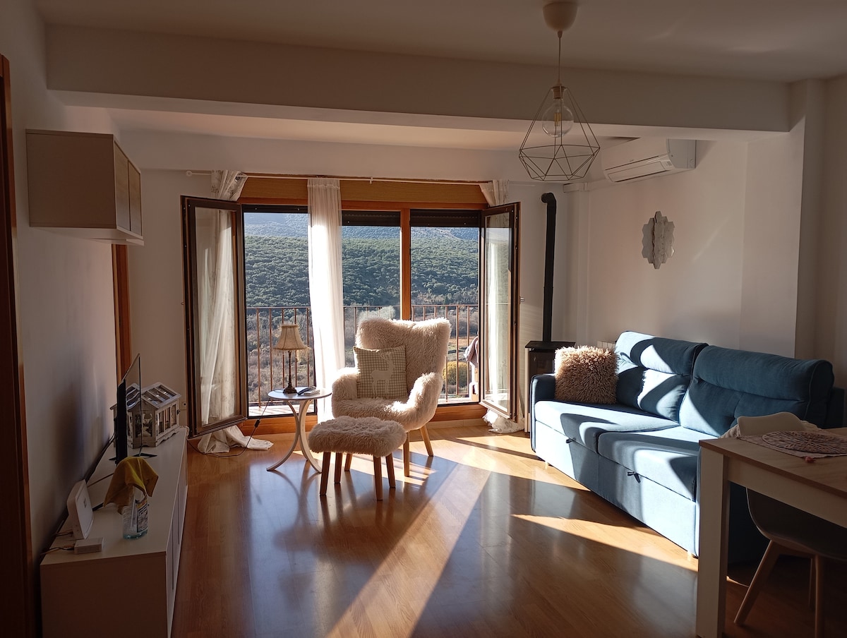 Pequeño apartamento completo en pueblo a 45km de Zaragoza. Ideal para dos personas.Muy luminoso, dormitorio, con cama doble ,balcón y baño con ducha dentro .Salon con cocina abierta y una terraza amueblada . Aire acondicionado y calefaccion. Wifi. Apartamento con entrada independiente . un solo dormitorio . Capacidad para cuatro personas. Durmiendo dos en el sofá cama. Esta en la entrada del pueblo y al lado de la huerta con un precioso paseo para disfrutar de la naturaleza y la tranquilidad