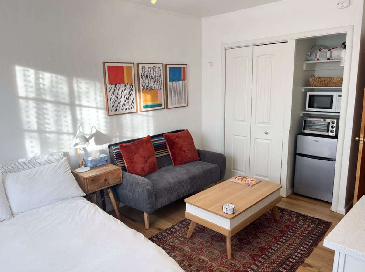 Welcome to Santa Fe! This charming studio cottage and my home share the property in this quiet residential neighborhood. The cottage is full of Santa Fe charm with a cozy, pretty interior, skylights and lots of natural light, a fully-stocked kitchen corner, handmade cabinets, Mexican tile, one comfy queen-sized bed, and a private garden patio. It's a quiet haven but centrally located, just 2 miles from the Plaza/downtown. It's a lovely place for couples, solo adventurers, and business travelers.