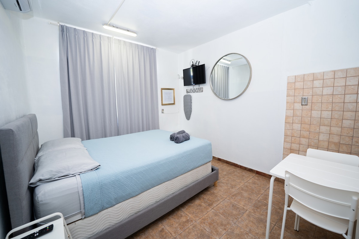 A unique place in a 80 year old house converted to a cozy suite. With a queen bed, a space for relaxation, and a full bathroom, what was once a kitchen of a beautiful old town house will now receive travelers from Puerto Rico and around the world in beautiful Aguadilla The suite was created with a smart use of the space, including a private bedroom, with a private entrance and a bathroom. Also, a small table for eating or work. Wifi is included. A patio can be enjoyed by guests..