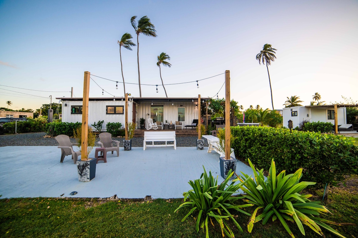 This place to stay is truly one of a kind. A one bedroom shipping container tiny home with double private terrace, master bathroom, full kitchen, and free parking space on premises. Located on Jobos cliff, wake up to stunning ocean views on and enjoy the ocean breeze while you have breakfast in one of the two private terraces of this lovely home. A full kitchen with a Berkey water filter, gas stove, Ninja blender, greca coffee maker, and many other amenities to enjoy your stay.