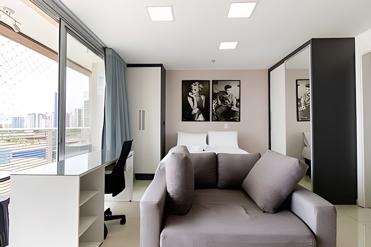 Viva a experiência StudioK: um refúgio de natureza e sofisticação no coração de Águas Claras. Nosso studio une o design clean à leveza das plantas, oferecendo mimos exclusivos, enxoval premium e cozinha com geladeira 380L. Desfrute de TV 4K giratória e ar-condicionado potente. No DF Plaza, você tem acesso direto a piscinas, academia de elite e aos melhores restaurantes (Coco Bambu/Outback) via elevador. O cenário perfeito para casais e executivos. Sinta-se em casa!