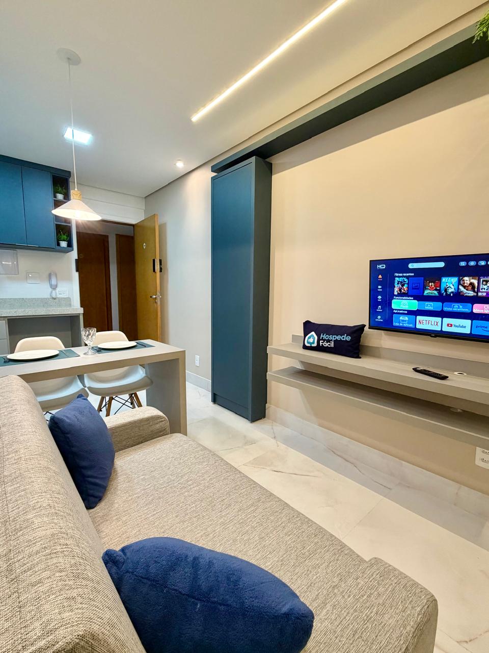 HOSPEDE-SE COM CONFORTO E SOFISTICAÇÃO DENTRO DE UM SHOPPING EM ÁGUAS CLARAS! Apartamento no 1º andar, alto padrão, planejado, decorado em cada detalhe, silencioso, equipado com diversos utensílios, cama QUEEN, TV 60 polegadas e um sofá-cama. Possui VAGA DE GARAGEM. Perfeito para quem busca conforto, segurança e praticidade. Ideal para acomodar até três pessoas.
