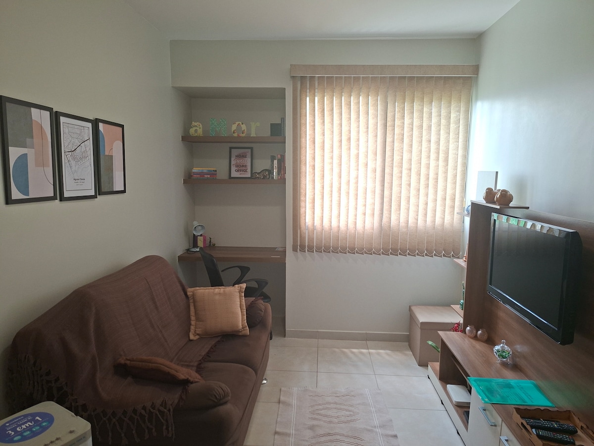 Aconchegante apartamento com ar condicionado, com uma excelente localização: dentro do DF-plaza shopping em Águas Claras. Conta com uma praça de alimentação com opções como: Outback, Coco bambu, L'Entrecôte de Paris, Self-service, Fast food, Padaria, Supermercado Carrefour 24 horas, entre outros.. no qual você tem acesso apenas apertando o térreo do elevador, uma experiência sem igual! Próximo a duas estações de metrô e na saída a pista principal que da acesso ao centro de Brasília (EPTG).