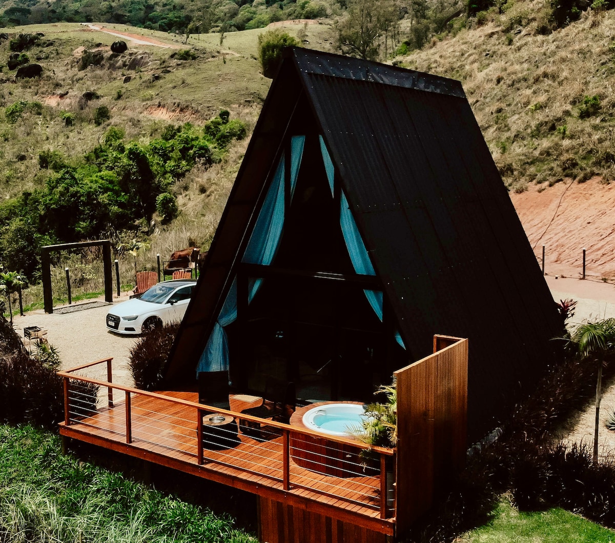 Relaxe neste espaço calmo e estiloso, com uma vista incrível das montanhas. A cabana oferece cozinha completa, cama queen, banheiro moderno e ar-condicionado. Do lado de fora, aproveite o pergolado com banheira de hidromassagem aquecida, perfeito para relaxar. Desfrute do redário, fogueira. O espaço é exclusivo.
