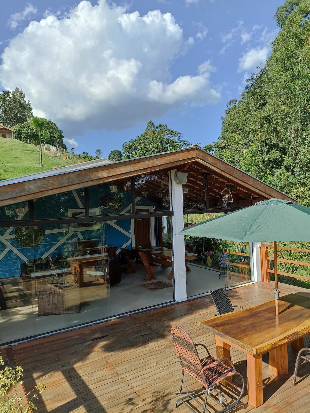 Casa modelo rústico com arvores ao redor, churrasqueira com vista para a natureza, um deck de frente para as montanhas e lago, por ser um local rural as folhas em seus detalhes fazem a decoração, piscina com privacidade e uma trilha ecológica com escada de pneus super atrativa. temos o cuidado de manter todo o espaço dedetizado conforme certificado apresentado da parede da cozinha.