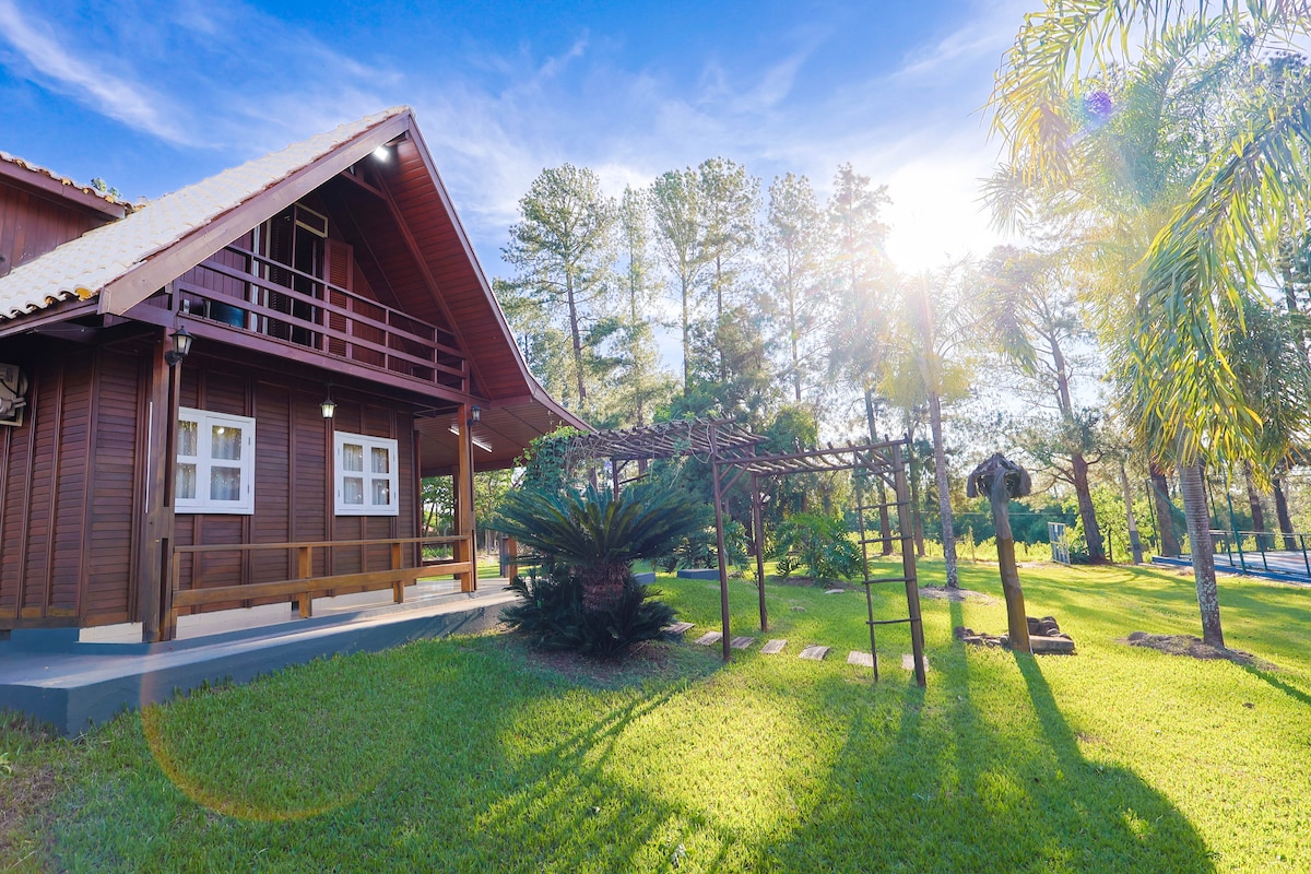 Viva a simplicidade da vida no campo! Chalés rústicos que acomodam até 4 pessoas, com mezanino, cozinha equipada, banheiro privativo, TV, ventilador e churrasqueira. Conecte-se com a natureza e aproveite para fazer a trilhatearapia, sentir o ar puro e contemplar no lago. Se exercitar no campo de futebol, jogar vôlei e depois se refrescar na piscina semiolímpica. A apenas 3 km da cidade, o refúgio ideal para quem busca tranquilidade e contato com o verde.