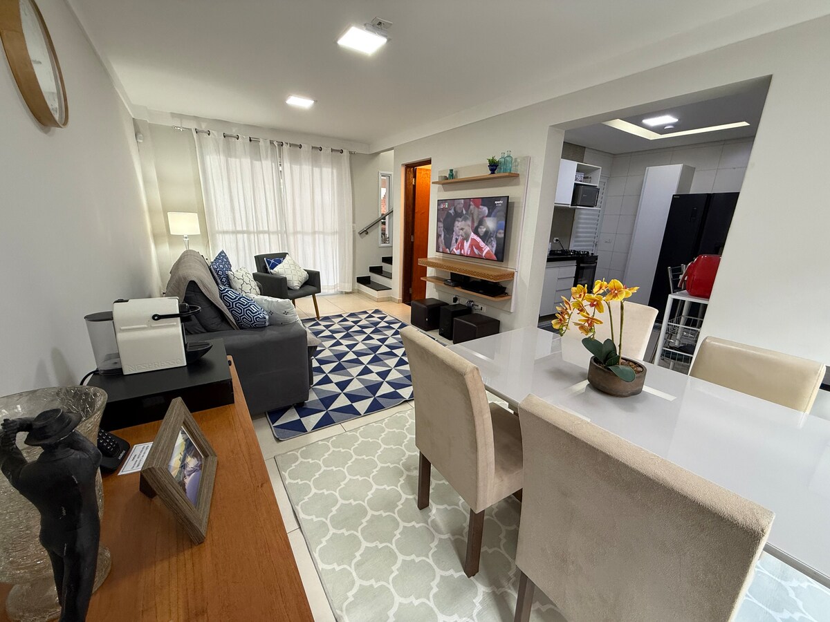 Relaxe com sua família nesta casa tranquila e completa! A apenas 650m da praça principal, você estará perto de tudo: mercados, farmácias e docerias. O que oferecemos: Wi-Fi, Ar-condicionado e Smart TV. Cozinha equipada (micro-ondas, cafeteira) e lavanderia. Cama box + sofá-cama de casal. Enxoval de cama e banho incluso. Jardim e garagem coberta. Obs: O imóvel é um sobrado; no andar superior funciona uma clínica de fisioterapia do meu filho atende em horários específicos.