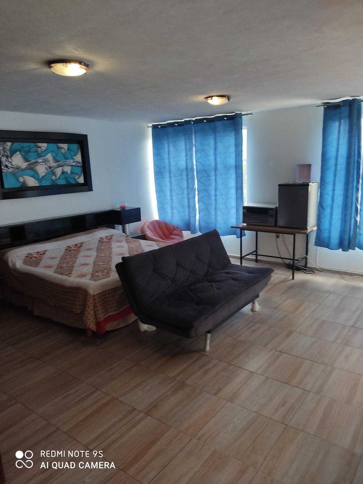 Estudio con todo lo necesario para disfrutar de tu estancia en la ciudad, privado, iluminado, dentro de un coto tranquilo para que te relajes y disfrutes y con una decoración moderna y minimalista. El estudio cuenta con baño propio y entrada independiente, cama matrimonial, refrigerador, microondas y cafetera. Puedes hacer uso de la piscina y casa club del coto* Oxxo: 120 m Farmacia: 1 km Restaurantes: 10min Cebteo comercial: 12 min Zona centro/feria: 25 min Esperamos recibirte con gusto.