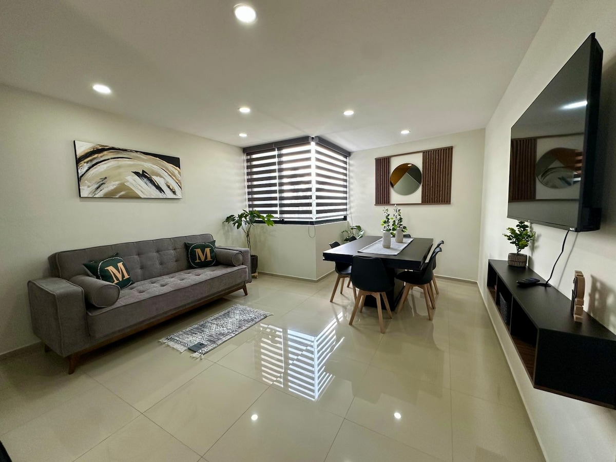 Ven y disfruta tu estancia en la bella ciudad de Aguascalientes con nosotros. Departamento muy bonito, céntrico con interiores modernos, el espacio cuenta con cocina, comedor, 2 recamaras bastante cómodas,amplias y acogedoras, 2 baños completos, cochera privada para 1 auto.