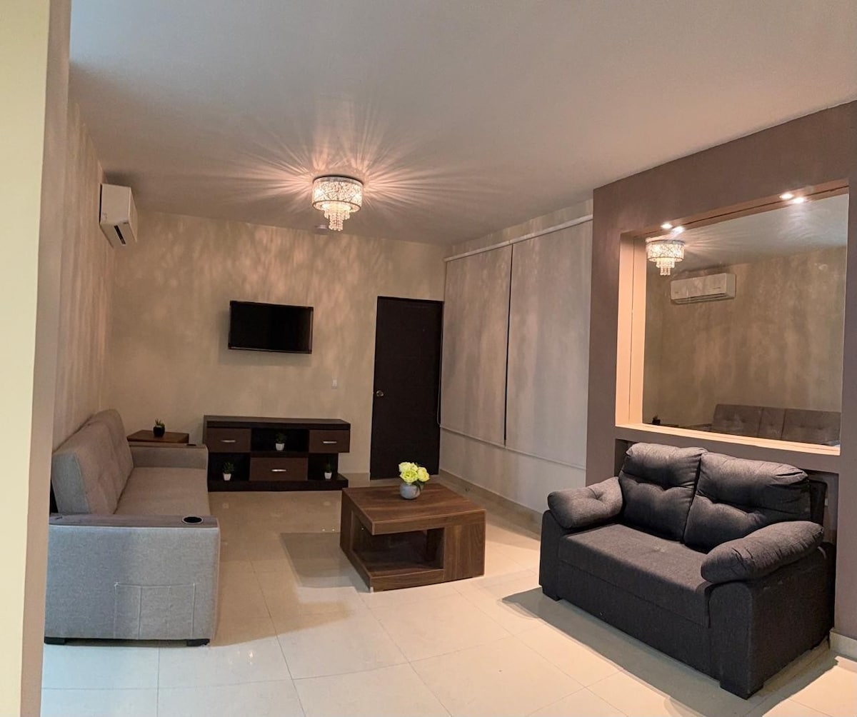 Omega Black, New Apartment 7 min from Colosio Av. Amazing view from 8th floor, TV 75", 65" and 58", private terrace, Optional AC for main bedroom $300 per night. 24 Hr security guard, private parking, and 2 elevators. Currently Building ammenities are restricted for Airbnb. Commercial center with Starbucks and Gold Gym at one side of the tower. One car allowed.