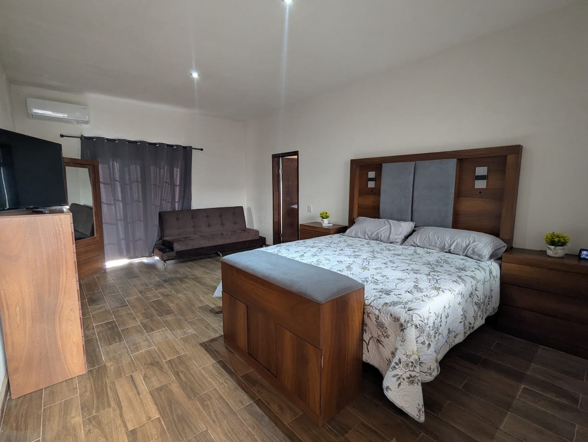 Bonito departamento con terraza en segunda planta con una cama King size, un sofá-cama y un sofá. Contamos con pantalla S-Mart TV para que puedas acceder a tus plataformas preferidas. El departamento se encuentra cerca de las avenidas principales de la ciudad, por lo que facilita el acceso al centro histórico, así como la movilidad al sur de la ciudad. Cuenta con cochera techada y portón eléctrico. Hay todo tipo de comercios a menos de 5 minutos caminando. ***Facturamos tu estancia***