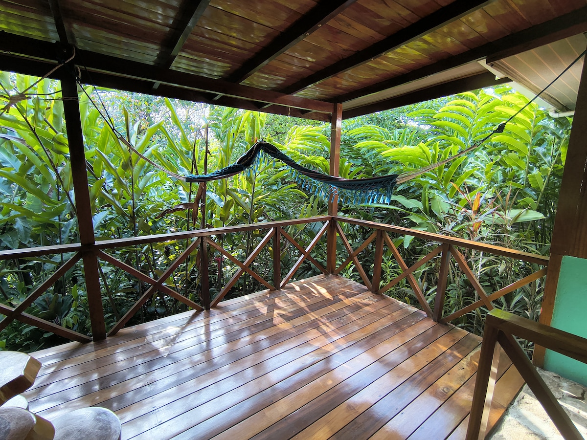 Our cosy cabins are nestled in the heart of Costa Rica's lush landscape surrounded by vibrant green foliage and towering trees. The new cabins have outdoor kitchens and large windows that invite in the beauty of the outdoors The grounds are a secluded paradise of rich biodiversity with colourful plants and blossoming flowers and local wildlife yet we're a 15 min leisurely stroll from the beach and shops and bars or a 3 minute car ride. The host speaks English, French and basic Spanish