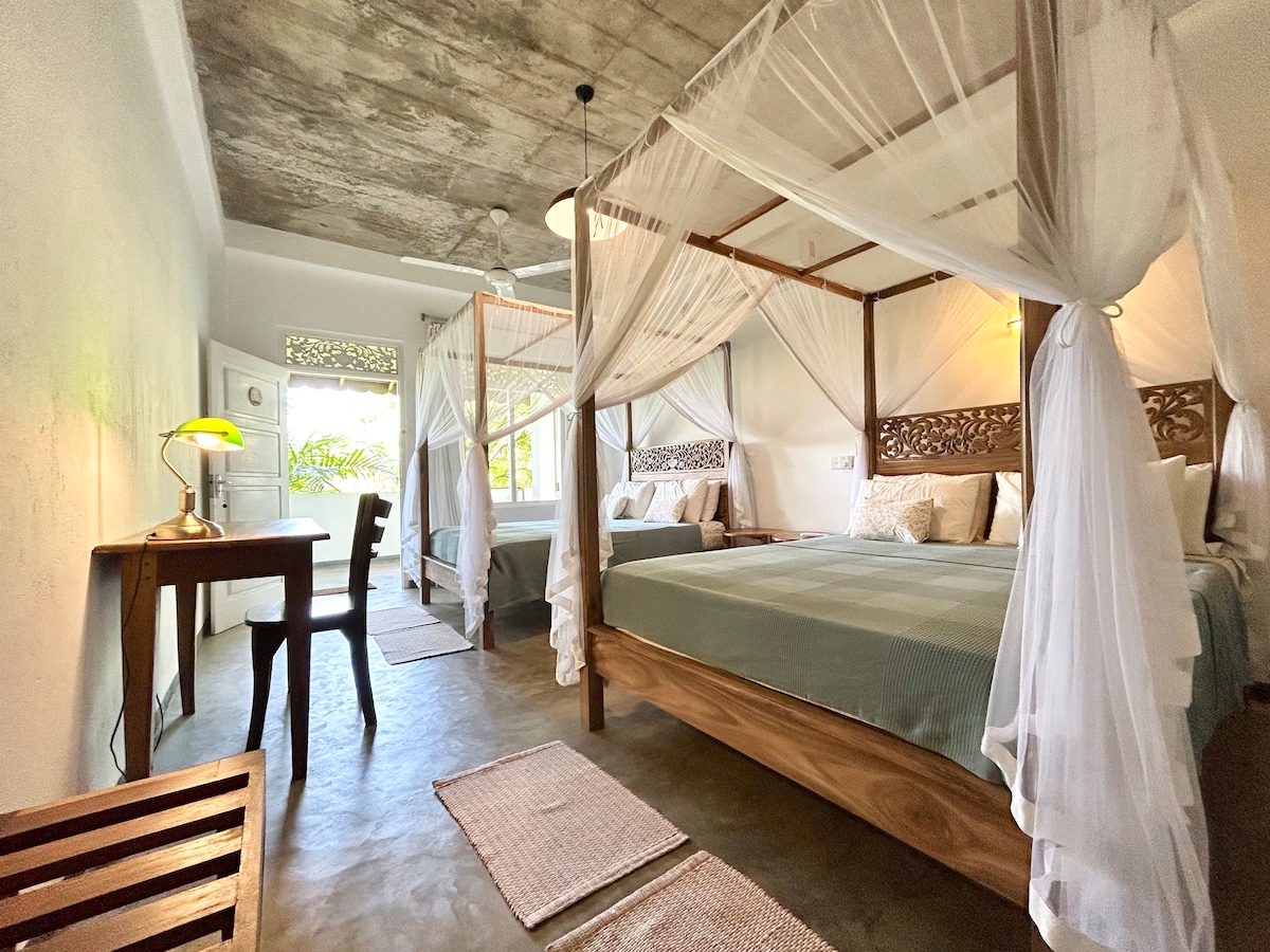 "Mirissa Bed and Breakfast" NEWLY TILED (Feb 2025) bedroom floor. Enjoy our garden with the breezy breakfast house, the chill-out space on the first floor and our rooftop, which is perfect for watching the sunrise with a coffee or the sunset with a chilled beer. We are serious about style and comfort! Our individually styled rooms are bright and spacious, with private attached bathroom, AC, and a desk and a chair for those who want to work.