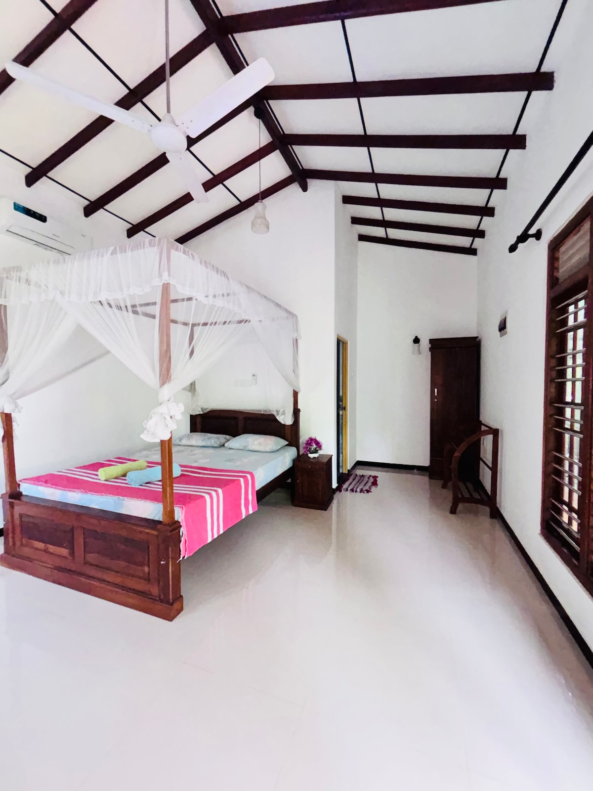 Relax with the whole family at this peaceful place to stay. Fully furnished villa with four spacious air conditioned and private balcony having bedrooms. Two bathrooms are attached, and one common with hot water. Two living areas, fully equipped open kitchen and spacious roof top. The supermarket is 200m away and public transport 75m away. To Polhena beach 600m, Madiha surfing spot 1km, Waligama tourism town 8km, Mirissa tourism area 5km.
