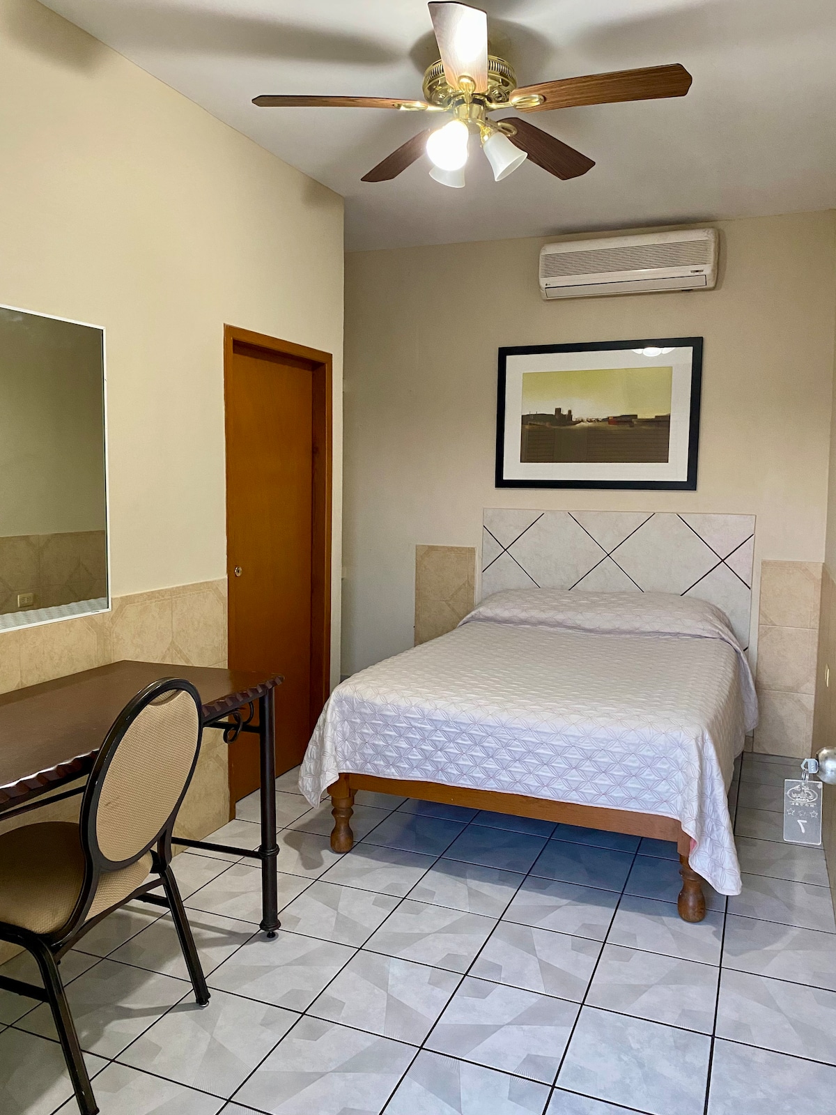 Habitación estilo colonial, con aire acondicionado, buena iluminación, espacio de trabajo y baño privado, se realiza limpieza diaria.