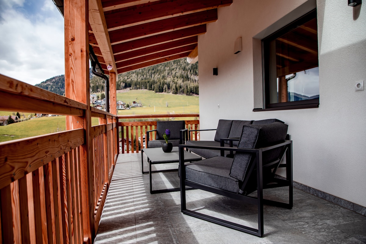 Appartamento mansardato quasi interamente rivestito di legno antico e arredato in modo tradizionale, dotato di zona giorno con ampio divano letto e smart tv, tavolo da pranzo, cucina attrezzata con tutti i principali elettrodomestici compresi forno e lavastoviglie. l punti di forza dell’appartamento sono lo spazioso balcone rivolto a est con vista su Santa Maddalena, per godersi il sole del mattino davanti a una bella colazione, e la nuovissima sauna privata in legno di cirmolo.