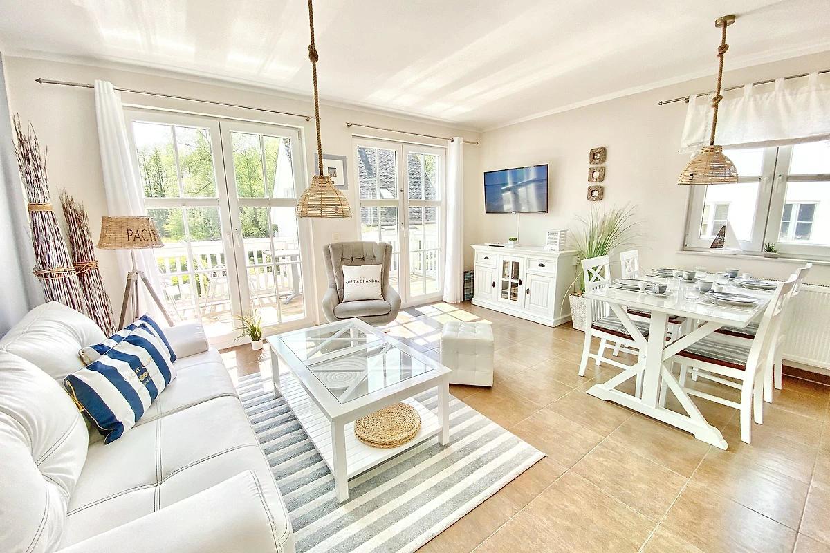 Unter unserem Reetdach haben Sie den Bodden im Blick – die 70 qm große Wohnung teilt sich in zwei Schlafzimmer und einen sehr großzügigen Wohn- und Essbereich auf. Hinzu kommt ein Badezimmer mit Dusche, Toilette und kuschliger Eckbadewanne. Im Wohnbereich mit Sofas und Sessel sorgt der Kamin in stürmischen Zeiten für wohlige Wärme. Die voll ausgestattete Küche lädt zu geselligen Kochabenden ein.