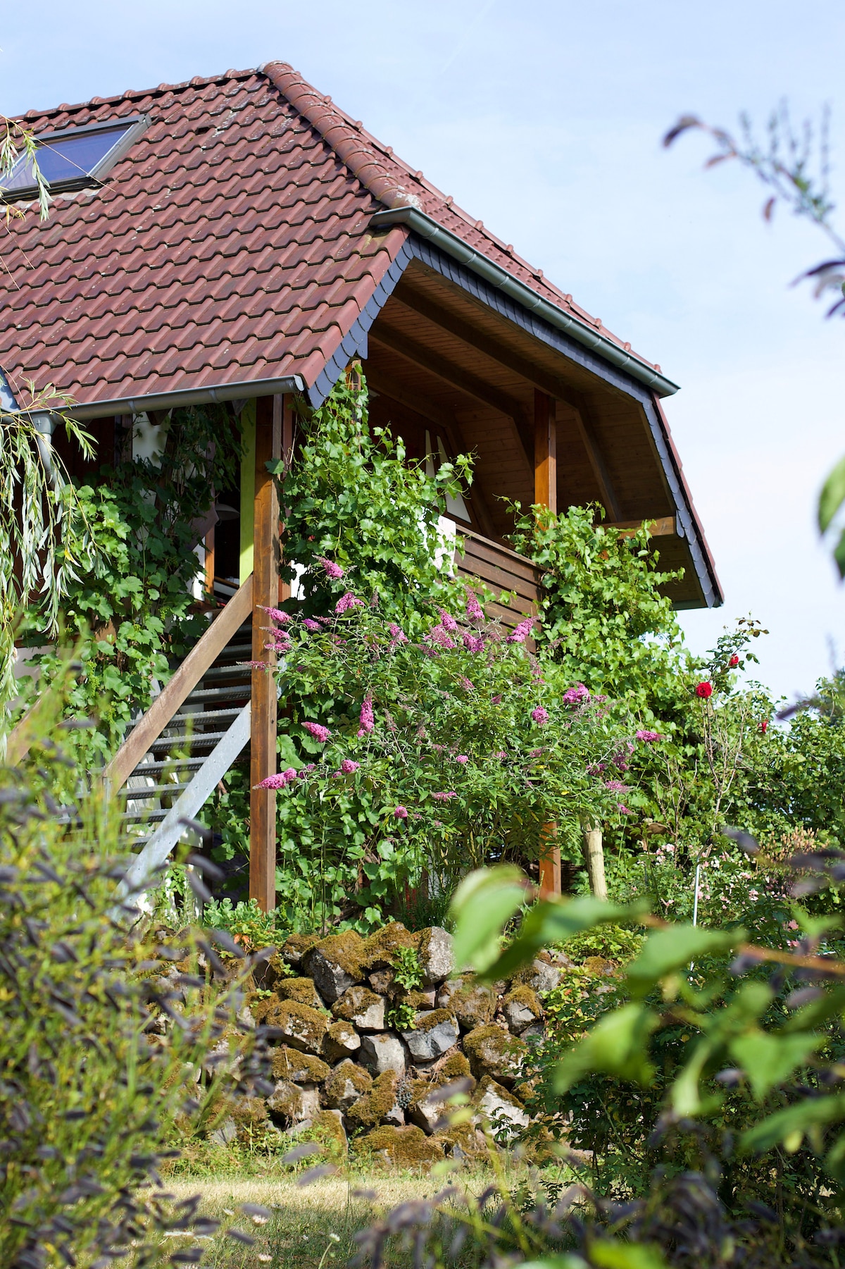 In dieser Ferienwohnung mit eigenem Eingang kann man sich rundum wohl fühlen. Alle Böden sind aus Naturholz, die Wände aus Lehmziegel, die Raumatmosphäre sehr angenehm. Auf dem Südwestbalkon hat man eine wunderbare Aussicht über das wild-gepflegte Grundstück, den Wald und das Damwildgehege des Nachbarn. Der Außenbereich und Sauna (kostenpf.) stehen zur Benutzung zur Verfügung. Die Wohnung liegt nur 4 km vom historischen Stadtkern Bad Münstereifel entfernt. Entspannung -Sport - Natur - Einkaufen